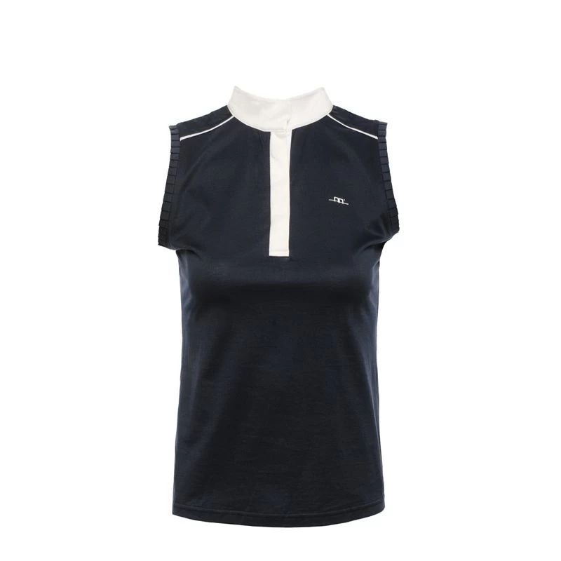 The Monza is sleeveless, so its cool and comfortable and won’t bunch up under your show coat. It is made of cotton with a luxury soft hand feel. It snaps closed to competition collar, and has pleated sleeve/shoulder detail.
