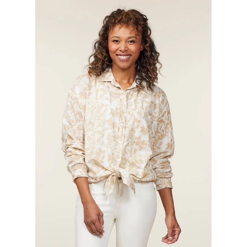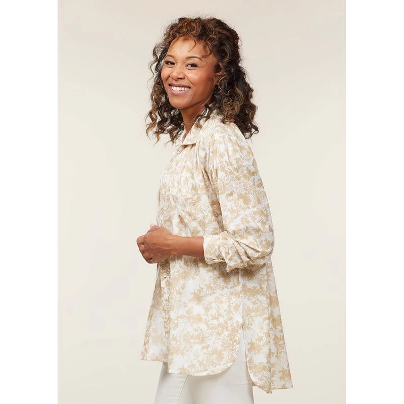 This top features everything you love about a button up, plus a tailored cut, trendy shirring, tuck-in-friendly side slits and a flattering, feminine fit. Roll the sleeves to lengthen your silhouette or tuck the tunic-length top into shorts for a modern classic summer look. Let your fashion imagination run wild as hounds and horses course through a semi-sheer countryside printtallyho!