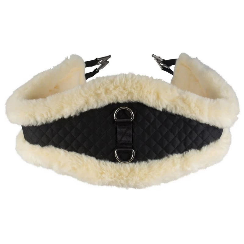 This girth fully lined with natural Sherpa fur is a nice option for horses with sensitive skin and aversion to the girth. The shell is created in quilted cotton with the shape designed to have the wider part at the center of the belly, this girth spreads the pressure to avoid discomfort. The 2-piece D-ring at center allows for attachments of your martingales, breastplates, and draw reins.
