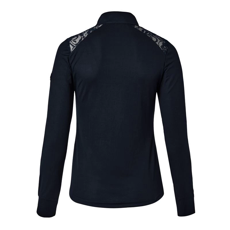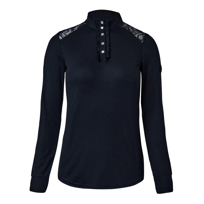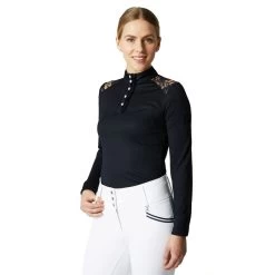 The Horze Sianna show shirt is made from breathable material that will keep you cool. Delicate lace at the shoulders looks elegant, and the buttons at the placket are extra chic. Timeless colors match your show wardrobe, and can easily be paired with your favorite show breeches and jacket.