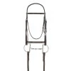This bridle features a comfort crown headpiece with a wide padded noseband and browband and browband with flash. Comes complete with laced reins.