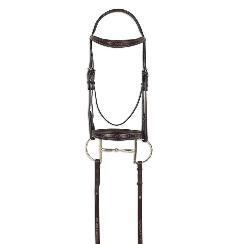 The ATS System provides the ultimate in comfort for your horse. The shaped top plate of the crown allows the ears to freely move, reducing the pressure, which eases muscle and nerve tension, and a thin layer of foam provides shock absorption. Crafted from hand finished full grain vegetable-tanned leather with a lustrous classic finish. With Anatomic Shaped Padded Monocrown, 1 1/4 Square Raised Fancy Stitched Tapered Padded Browband, 1 1/2 Square Raised Fancy Stitched Tapered Padded Noseband, Dual Adjustable Throatlatch and 5/8 x 54 Raised Fancy Stitched Laced Reins.