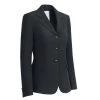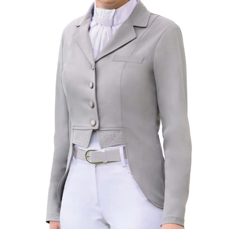 Featuring Euro-styled 4 buttons, classic silver buttons for a polished look, double back vent, subtle crystal detail at collar, front bottom panel and back, and decorative tone on tone rhinestone back. Made in stretch performance fabric with matching lining for freedom of movement while riding.